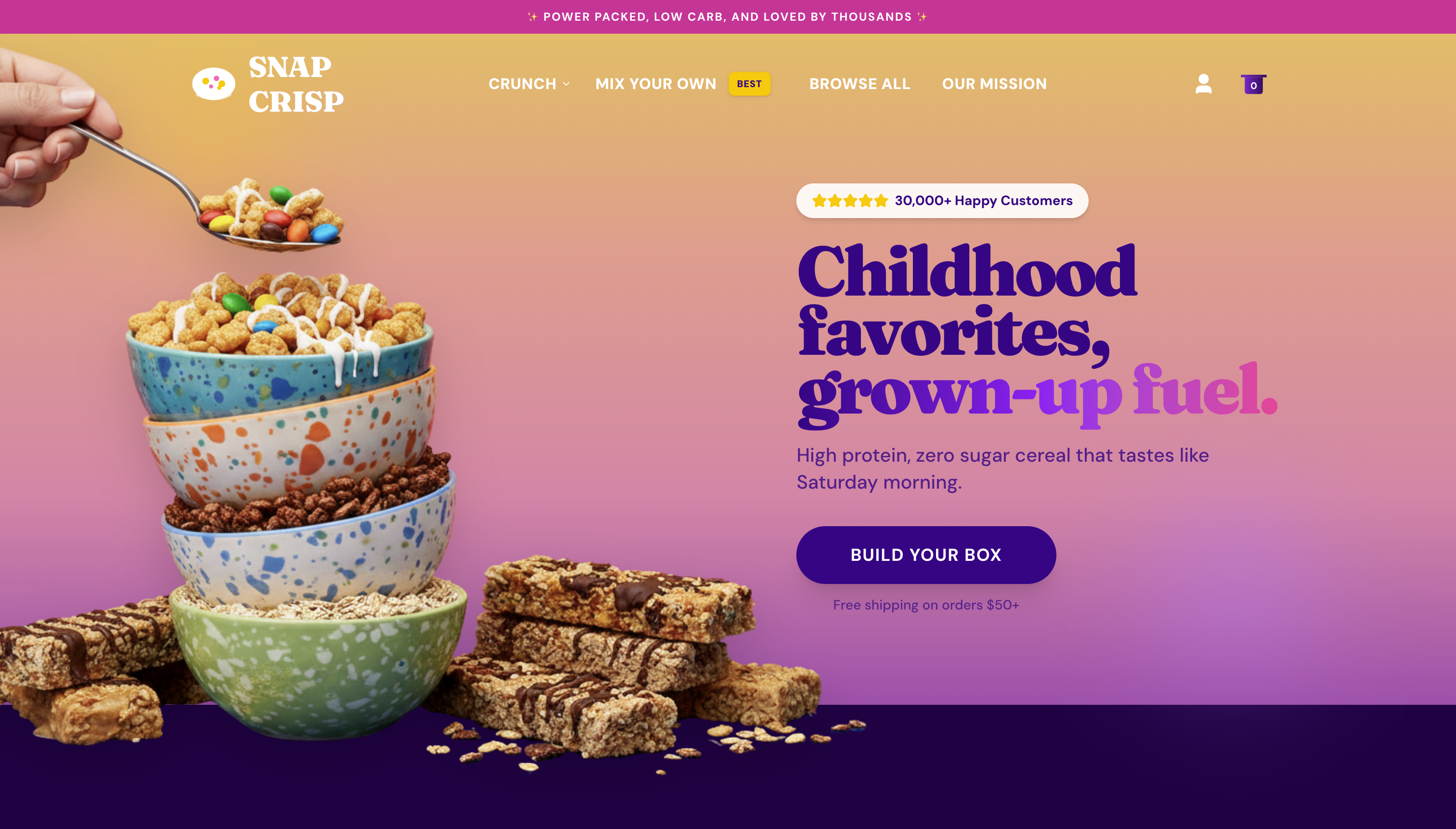 Snap Crisp is redefining how people enjoy cereal, granola, and treats at home. With a mission to deliver high-protein, low-carb breakfasts on a recurring basis, they needed a digital partner to build a subscription-first e-commerce experience that drives sustainable growth. Subcrafted partnered with Snap Crisp on a full build — designing the subscription architecture, optimizing product journeys, and creating a checkout flow that boosts conversion while increasing average order value.